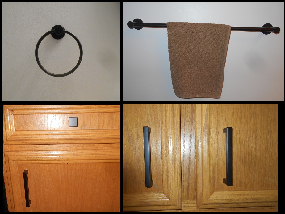 April 2025 - Multiple items installed for a repeat customer in Washington, including a towel ring, towel bar, TP hanger, and 20+ drawer knobs and cabinet pulls in the kitchen.