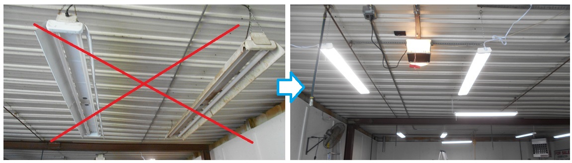 Old, failing fluorescent lights removed, new LED fixtures installed for a repeat customer.