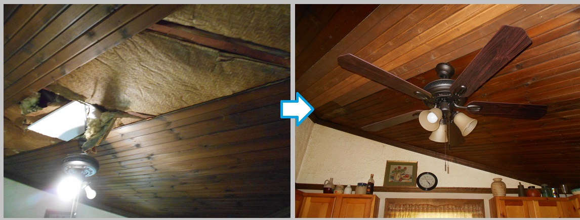 A customer assisted with replacement of ceiling boards, then a new fan installed.